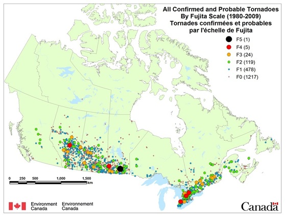 Les tornades sont répertoriées depuis 1980 au Canada, ce qui nous laisse une très faible fenêtre d'observation du phénomène. Ce que l'on peut observer, c'est que ce n'est pas un phénomène nouveau: